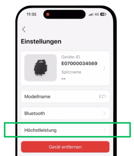 Klicke wieder auf Höchstleistung, stelle die maximale Leistung 800 Watt ein, indem Du den Regler verschiebst und klicke "Absenden". Es kann einige Minuten dauern bis der Wechselrichter sich aktualisiert.